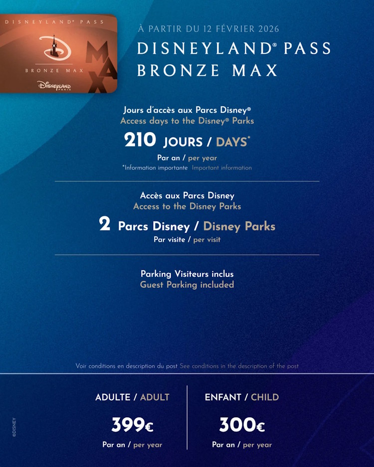 Let op: De Bronze (One of Max) is weliswaar het voordeligst in aanschaf, maar biedt je slechts 170 tot 210 dagen per jaar toegang tot de parken van Disneyland Parijs en is het niet mogelijk om direct 2 opeenvolgende dagen te reserveren.